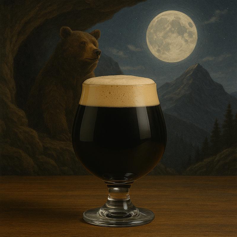 They say the Bear King dwells in a cave high upon Moon Mountain, where the night sky glows silver and the air hums with mystery. Travelers whisper of fires that flicker deep inside the cave and the sweet, roasted aroma that drifts down the slopes. Inspired by this legend, Moon Mountain Chocolate Stout is as dark and rich as the mountain’s shadow, with velvety cocoa notes that echo like a roar through the night.